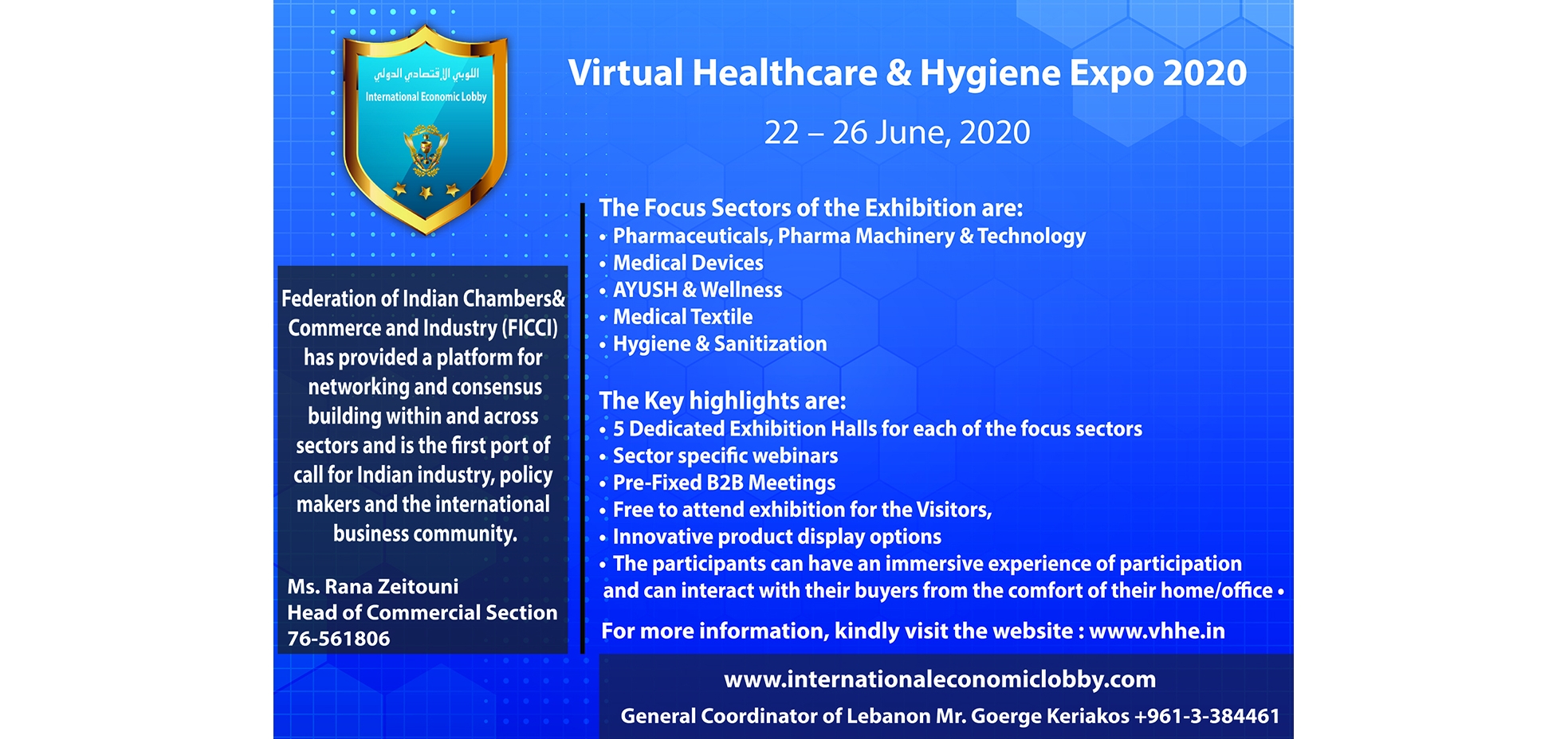 Indian Embassy commercial Sector Mr. Sudhanshu Gupta, Deputy Director, FICCI may kindly be reached at - MobileNo: +919873311557 - Email: sudhanshu.gupta@ficci.com; vhhebuyers@ficci.com.