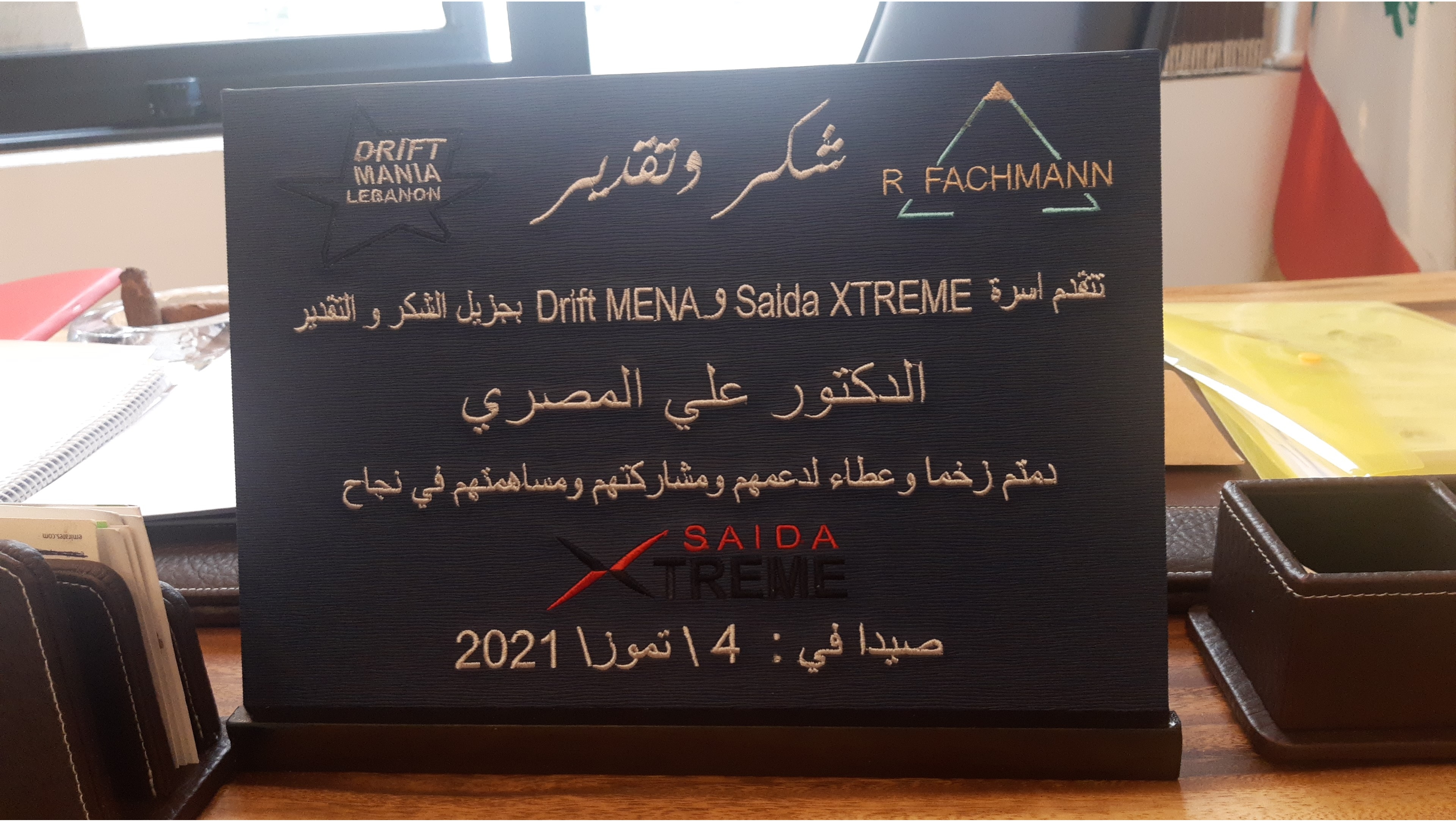 قدّمت السيّدة ربى عماد مؤسسة Xtreme درعًا تقديريًّا لشركة M.F.G Group الّتي يترأس مجلس ادارتها الدكتور علي المصري و قد استلمت الدرع التقديري مسؤؤلة المعارض في الشركة الآنسة ربيكا سليمان و ذلك كعربون شكر و تقدير لشركة M.F.G Group لمساهمتها بدعم و نجاح Xtreme Saida .